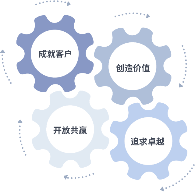 成就客户是一切决策的出发点,,,,创造价值是衡量所有工作的标准,,,,追求卓越是我们做事做人的态度,,开放共赢是我们的格局也是最终的结果。。。价值观的齿轮环环相扣,,,,推动着组织里的每个人不断向前。。