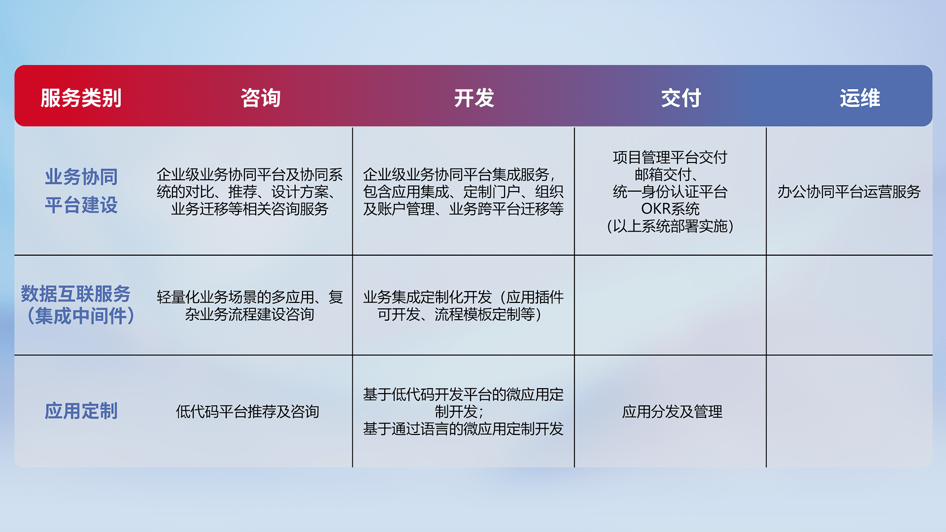 针对钉钉、、企微、、、IDaas等平台级产品提供产品的规划、、、、方案、、、交付、、定制化开发等服务,,,实现如统一协同办公、、、、智能客户服务、、、混合会议管理、、、智能数据查询、、、等业务场景,,,,实现数字化转型。。。。